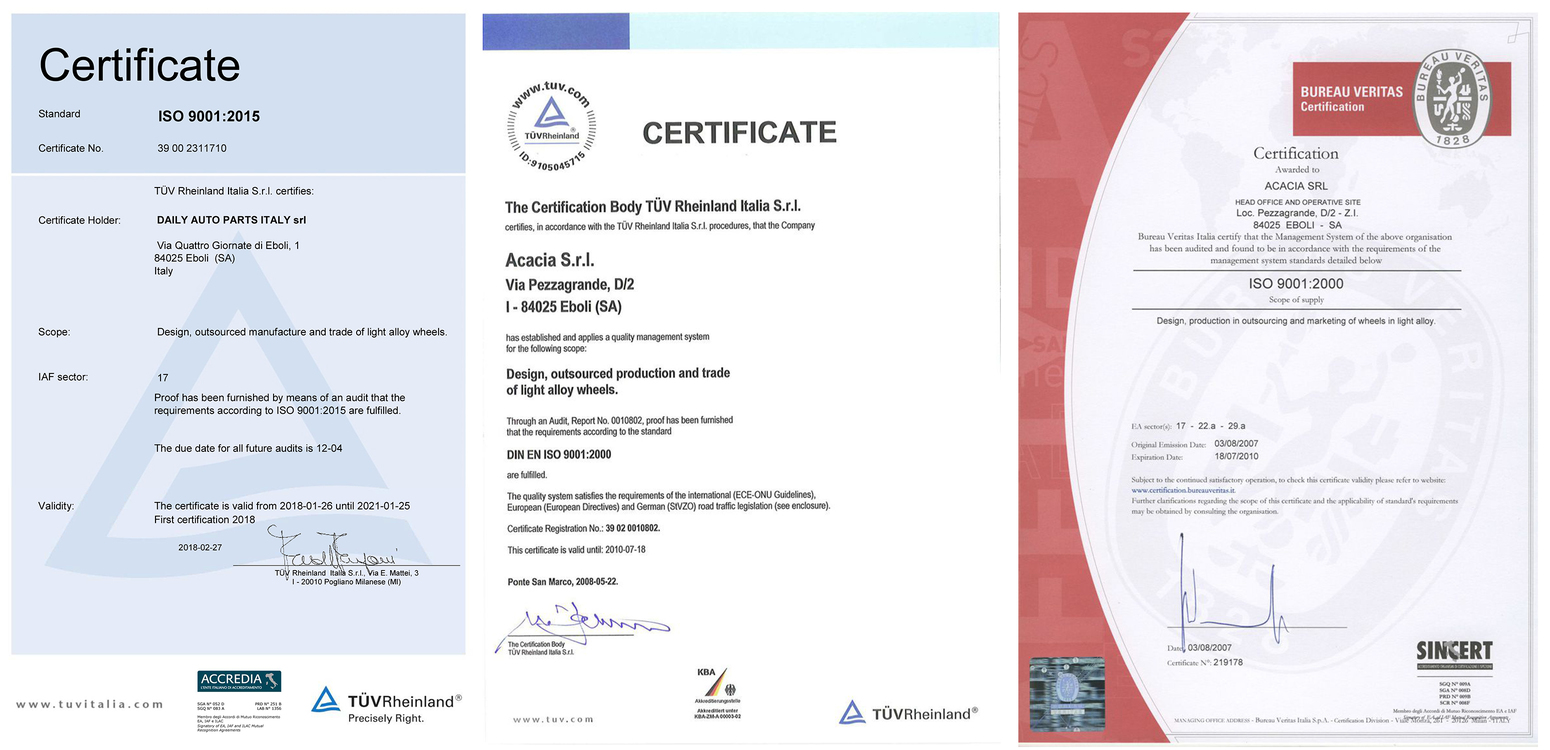 Проведення виробником випробувань відповідно до вимог стандартів JWL, UN / ECE гарантує високу якість продукції європейського рівня, і що найголовніше – безпеку. Сертифікати, видані незалежними європейськими організаціями Bureau Veritas Certification і Tuv Rheinland, гарантують те, що весь процес виготовлення дисків WSP Italy, починаючи з етапу розробки дизайну дисків, складання графіка виробничого процесу і закінчуючи процесом виготовлення, відповідає міжнародним стандартам якості.
